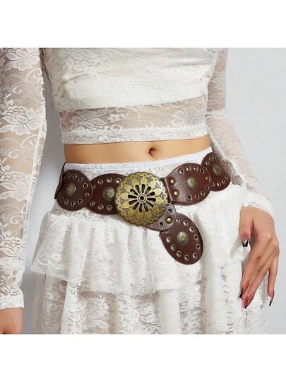 Cinturón con hebilla hueca con remaches, estilo vintage occidental, accesorio para combinar con faldas en festivales de música, fiestas, estilo Y2K, BOHO, otoño, Halloween - Marrón (hueco) - Añade 5