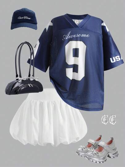 SHEIN Girlism Conjunto de 2 piezas para niñas preadolescentes: Camiseta de manga corta con cuello en V y estampado de letras + Falda con dobladillo abullonado - Azul Marino - Añade 4