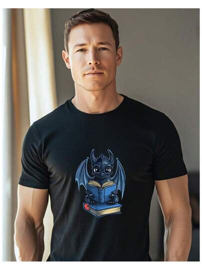 1 pieza, Camiseta impresa con diseño de dragón estudioso leyendo un libro, algodón de 180g - Negro - Añade 1