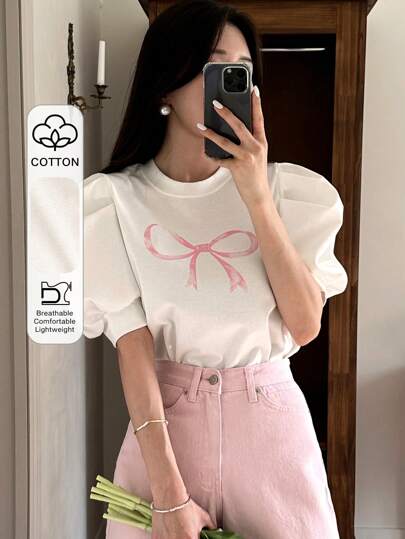DAZY Blusa casual de mujer con cuello redondo, manga corta y estampado de moño, para uso diario, camisetas gráficas, ropa de vuelta al colegio - Blanco - Añade 1