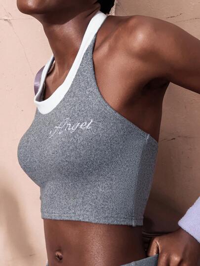 VARSITIE Camisetas y tirantes deportivos de mujer con borde contrastado, cuello halter y bordado - Gris Claro - Añade 3