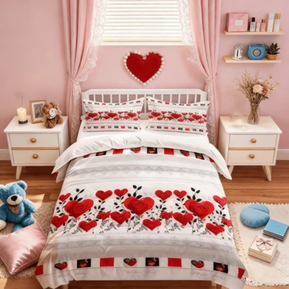 Juego de ropa de cama de San Valentín con rosa roja y corazón - Funda nórdica de poliéster con estampado floral romántico, regalo perfecto para la decoración de su dormitorio - Multicolor - Añade 5