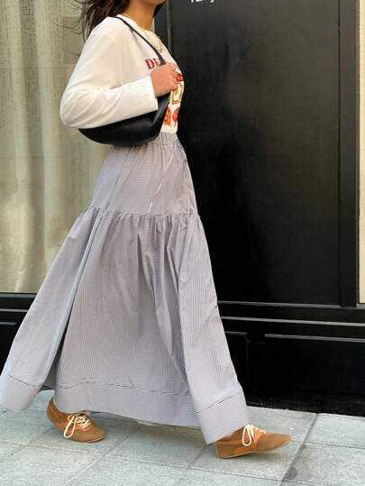 Veilorie Falda casual de línea A con estampado de cuadros, nudo y volantes en el bajo para mujer - Multicolor - Añade 1