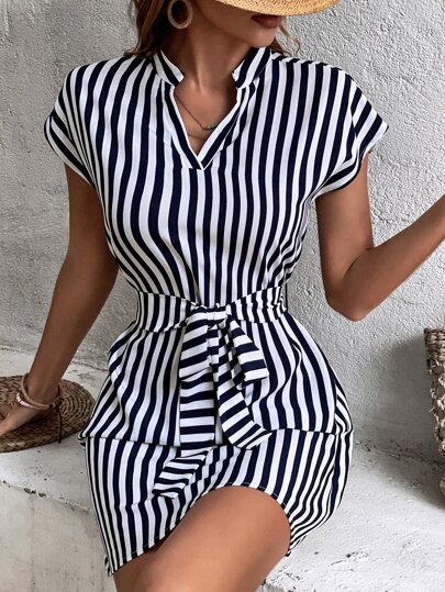SHEIN Clasi Vestido con cinturón de rayas verticales de cuello de muesca de manga murciélago - Azul y blanco - Añade 4