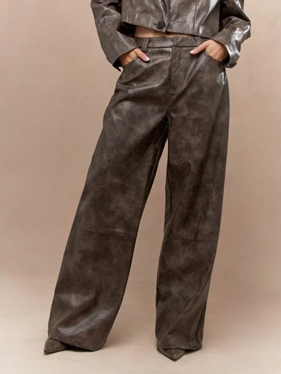 MISSGUIDED Pantalones anchos tipo baggy de PU lavado para usar en la oficina - Marrón - Añade 4