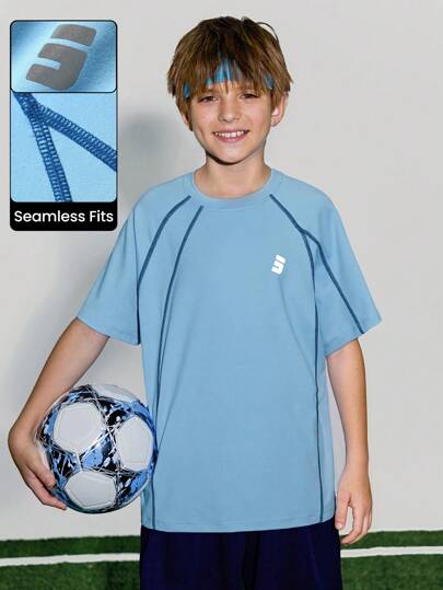 JNSQ Camiseta deportiva para niño preadolescente de vuelta al colegio, camiseta deportiva profesional para exteriores con cuello redondo, costura de 4 agujas y 6 hilos, diseño de contraste sin costuras y estampado reflectante 3M - Celeste - Añade 1