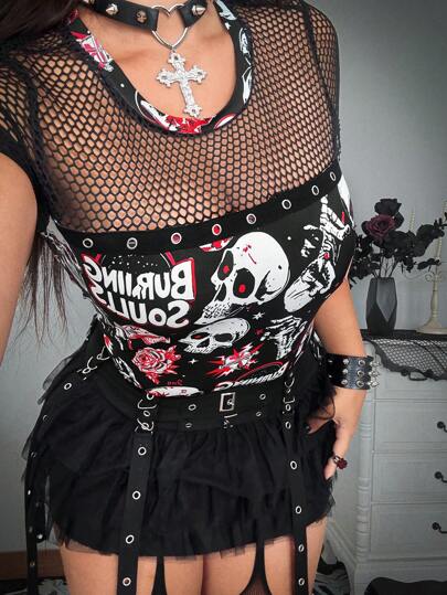 Whyspr Camiseta de manga corta de talla grande con estampado de calavera punk, de malla transparente y patchwork, para el verano - Negro - Añade 1