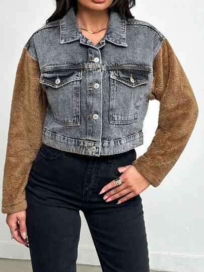 EURMUSE Chaqueta De Mezclilla De Manga Larga Para Mujer Con Remiendo De Felpa - Gris - Añade 1