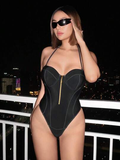 Swim EVENT Traje de baño de una pieza para mujer con cremallera frontal y cuello halter para el verano - Negro - Añade 1