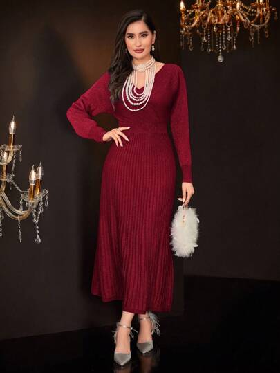 Modelyn Vestido De Suéter De Manga Murciélago Con Cuello En V Para Mujeres - Burdeos - Añade 3