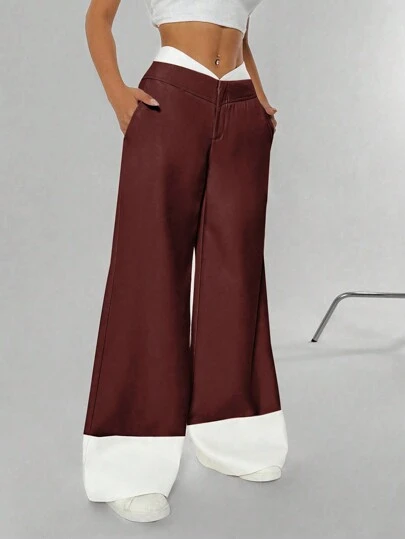 SHEIN Unity Pantalón ancho casual de mujer para otoño con bolsillo en diagonal y contraste de color - Burdeos - Añade 5