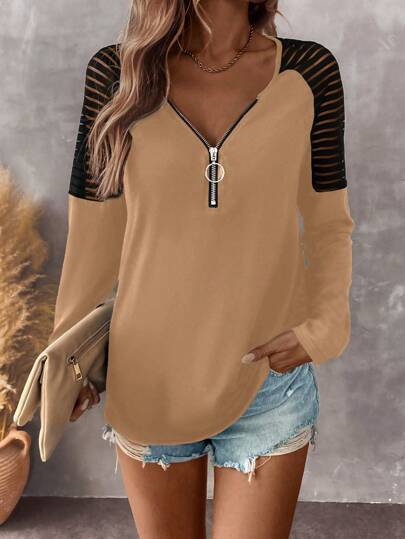 SHEIN LUNE Camiseta de punto casual con mangas raglán, cuello en V, cierre de cremallera expuesta y diseño de patchwork para mujer en otoño - Albaricoque - Añade 1