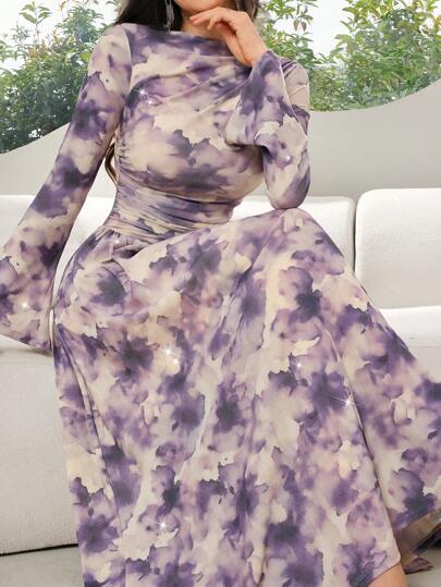 Modelyn Vestido elegante de mujer con cuello redondo, manga larga, plisado y volante en el bajo, con estampado de batik - Multicolor - Añade 1