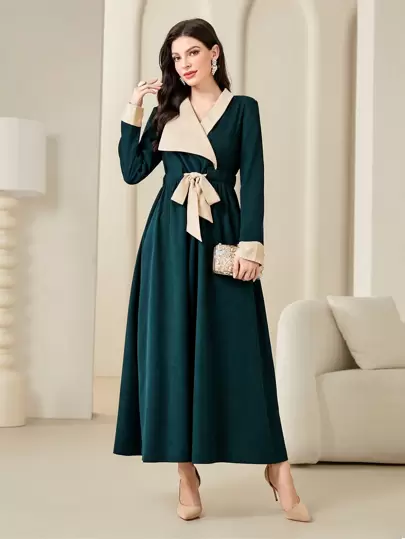 Modelyn Vestido largo de estilo árabe con cinturón y bloques de color para mujer, vestido de noche - Verde - Añade 1