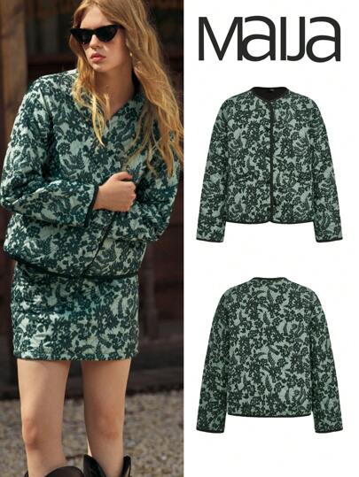 Maija Abrigo acolchado de manga larga con botones, estampado floral y bloqueo de colores en estilo bohemio para mujer, cálido para otoño/invierno - Verde Oscuro - Añade 1