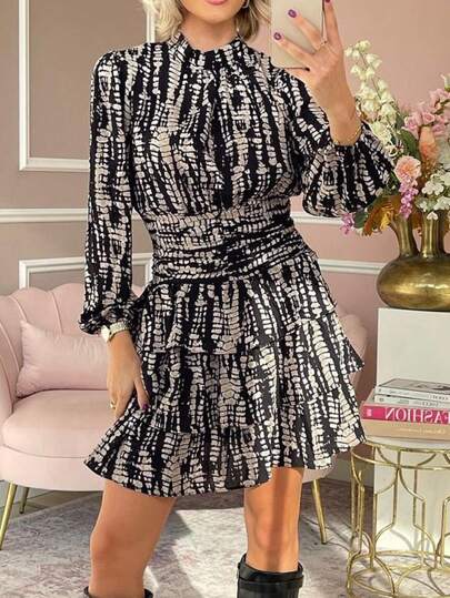 Chiquease Vestido casual para mujer con capas, mangas tipo farol con ribete de volantes y dobladillo de hoja de loto - Negro - Añade 1