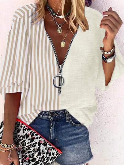 EMERY ROSE Blusa casual de mujer con estampado de rayas y parches, manga abullonada, para vacaciones - Albaricoque - Añade 1