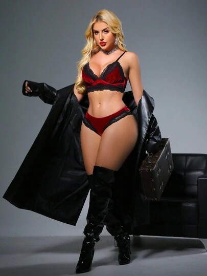 SHEIN Conjunto de lencería sexy con encaje en contraste para mujer - Burdeos - Añade 1