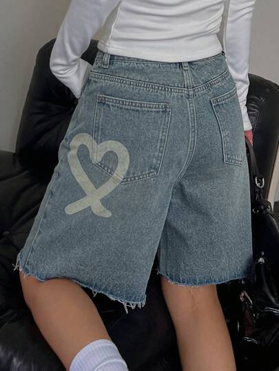 DAZY Short de mezclilla con estampado de corazón desgastado para mujer - Azul lavado medio - Añade 8
