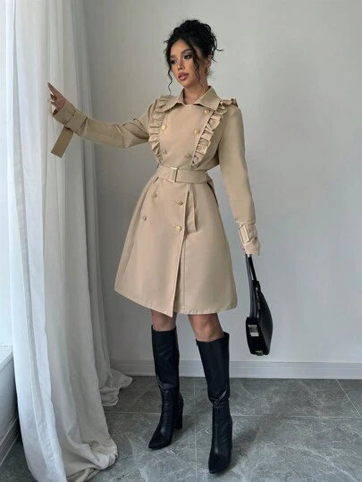 Elenzga Abrigo gabardina de mujer con doble botonadura, cintura, costuras princesa, botones metálicos y borde con volantes - Caqui - Añade 1