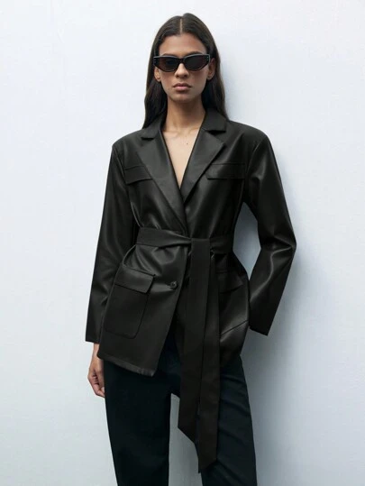 Maija Blazer de moda de manga larga con solapa y unicolor para principios de primavera - Negro - Añade 4