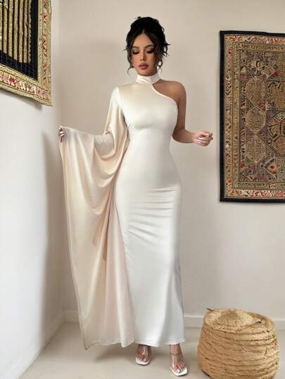Breezaya Vestido largo ajustado de un solo hombro elegante para mujer - Albaricoque - Añade 1