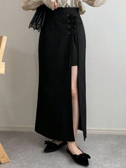 FRIFUL Falda cruzada con abertura de unicolor elegante para mujer, primavera y otoño - Negro - Añade 1