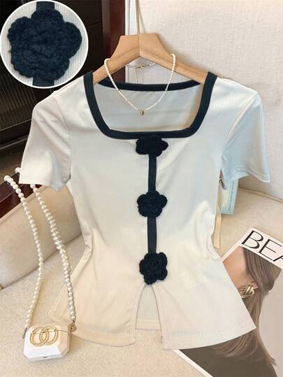 Chiquease Camiseta de mujer con decoración floral texturizada y bloqueo de color elegante - Albaricoque - Añade 8