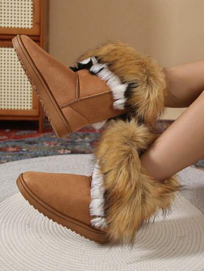 Botas De Nieve Integradas De Piel Y Piel Sintética De Moda Para Mujer - Marrón - Añade 1