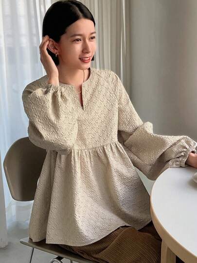FRIFUL Camiseta de mujer con mangas de farol y ribete de volantes - Caqui - Añade 1