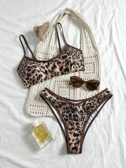 Swim Mod Conjunto de bikini con tirantes finos y estampado de leopardo con flores aleatorias, para mujer, para el verano - Multicolor - Añade 1