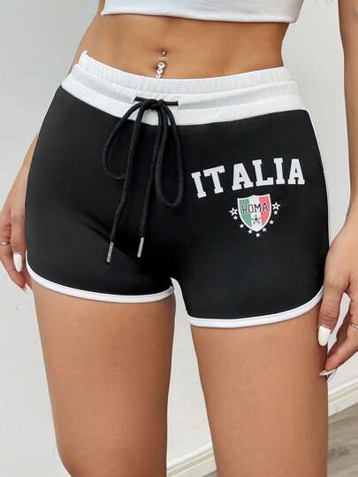 StreetHx Shorts casuales con cintura de cordón y estampado de letras para mujeres - Blanco y Negro - Añade 1