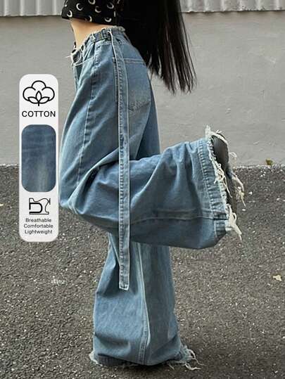 DAZY Jeans de pierna ancha y suelta con dobladillo deshilachado lavado para mujer - Azul lavado medio - Añade 1