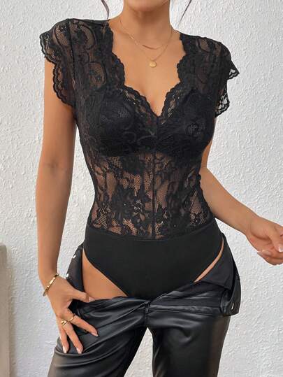 SHEIN PETITE Body minimalista de mujer con escote en V y encaje, adecuado para el ir y venir - Negro - Añade 5