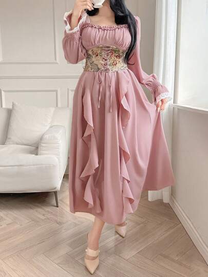 DAZY Vestido de manga larga y longitud media de estilo palaciego para otoño, vestido de gala con volantes de lujo, vestidos elegantes para mujeres - Rosa Pálido - Añade 5