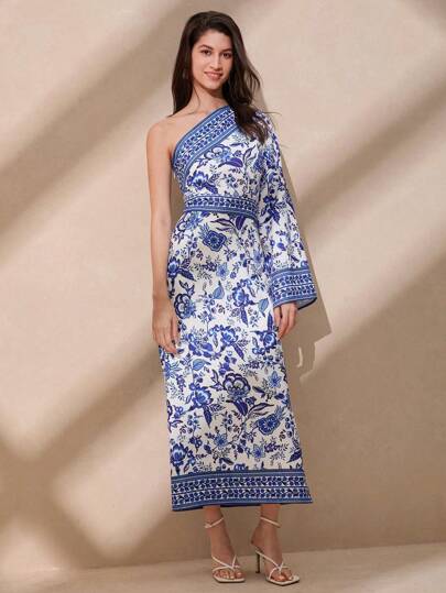 Anewsta Vestido de estilo retro para mujer con hombro oblicuo y estampado - Azul - Añade 1