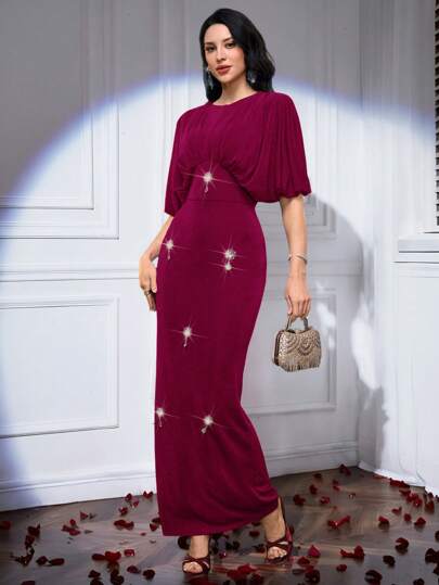Modelyn Vestido ajustado de mujer con cuello redondo, mangas de murciélago y decoración de cristales, elegante - Rojo violeta - Añade 1
