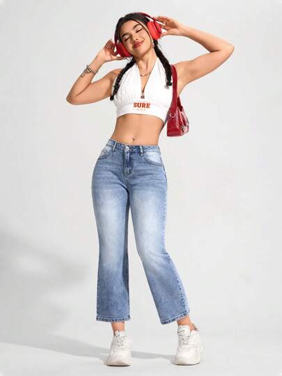 SHEIN EZwear Jeans de mezclilla casuales con bolsillos frontales y botones para mujer para uso diario - Lavado ligero - Añade 2