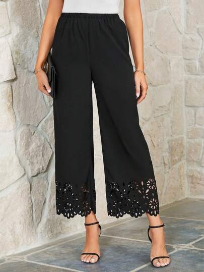 SHEIN Clasi Pantalones De Cintura Elástica De Color Sólido Para Mujer Con Dobladillo Ahuecado - Negro - Añade 3
