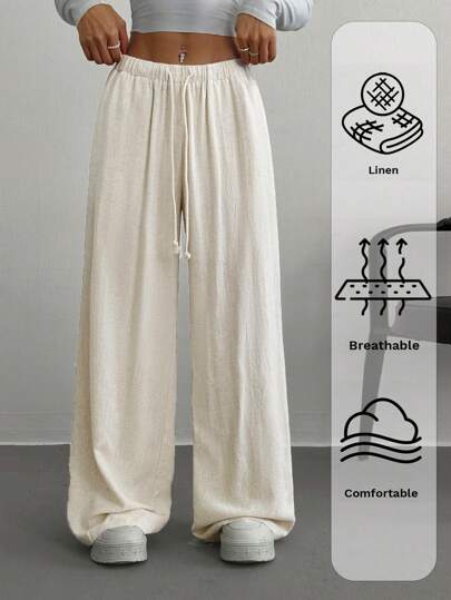 SHEIN EZwear Pantalones largos casuales sencillos de unicolor con bolsillos y cordones para mujer - Albaricoque - Añade 5