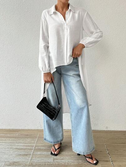 Chiquease Camisa casual con dobladillo asimétrico, botones parciales y unicolor para mujer - Blanco - Añade 1
