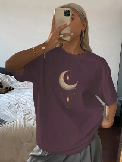 DAZY Camiseta gráfica holgada de mujer de manga corta o larga, cuello redondo, unicolor, de talla grande - Morado - Añade 1