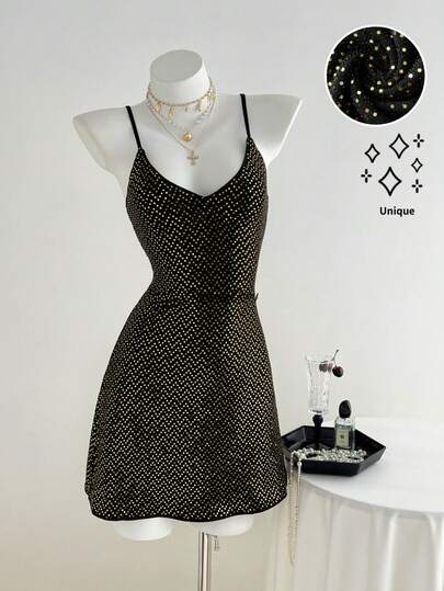 SHEIN Unity Vestido mini con tirantes finos, de unicolor y con lentejuelas, sexy y glamoroso para mujer - Negro - Añade 1