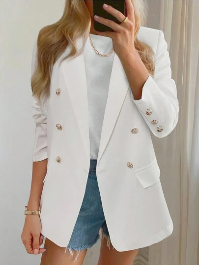 SHEIN Clasi Blazer casual de manga larga de unicolor simple para mujeres - Blanco - Añade 8