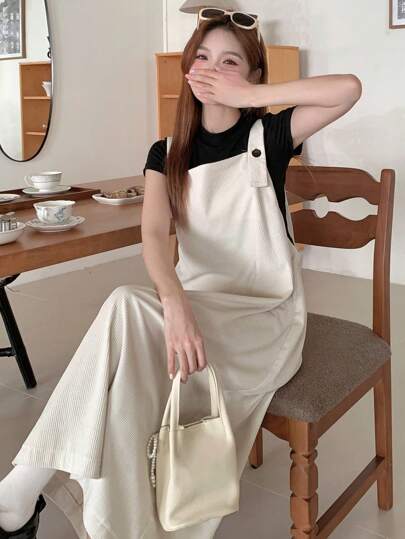 FRIFUL Vestido casual con peto de un solo color de mujer de pana simple - Beis - Añade 1