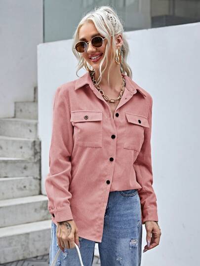 SHEIN LUNE Camisa de manga larga sencilla de unicolor para uso diario, blusa para mujeres - Rosado Sandía - Añade 1