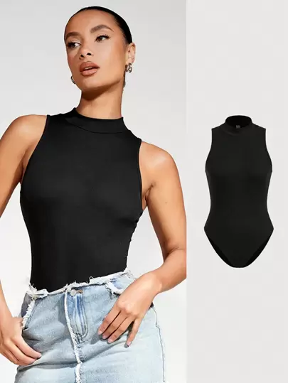 SHEIN BASICS Body Con Cuello Levantado De Color Liso Para Mujer - Negro - Añade 2