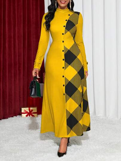 SHEIN Lady Vestido midi elegante de manga larga con botones y cuello alto de pata de gallo para mujer, ideal para trabajo, primavera y otoño - Amarillo - Añade 1