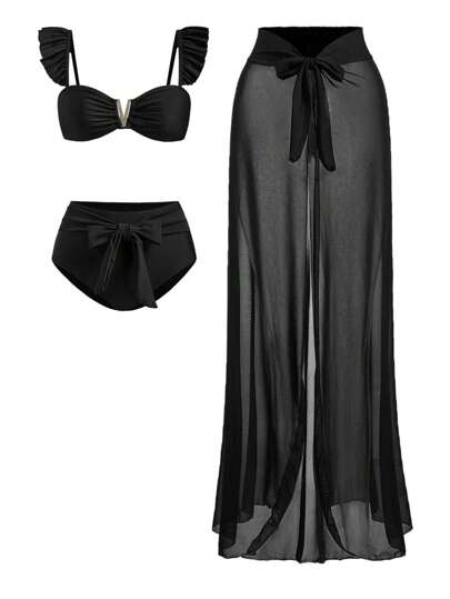 Swim Oasis Conjunto de bikini de 2 piezas con volantes y unicolor, incluyendo top halter y Bottom, con pareo y falda corta para mujer, ideal para la playa en verano - Negro - Añade 3