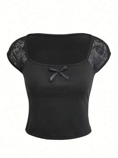 SHEIN LUNE Camiseta corta de mujer con mangas de encaje negro y parches - Negro - Añade 5
